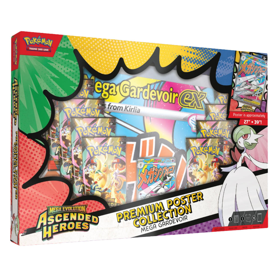 With strong attacks and big HP, Mega Lucario ex and Mega Gardevoir ex break through boundaries in battle! Team up with one of these powerful Mega Evolution Pokémon ex as a full-art foil promo card , then find even more Pokémon inside a stack of 10 booster packs from Mega Evolution—Ascended Heroes. You’ll also get a large poster showing off Mega Lucario or Mega Gardevoir and other Pokémon featured in this special expansion.